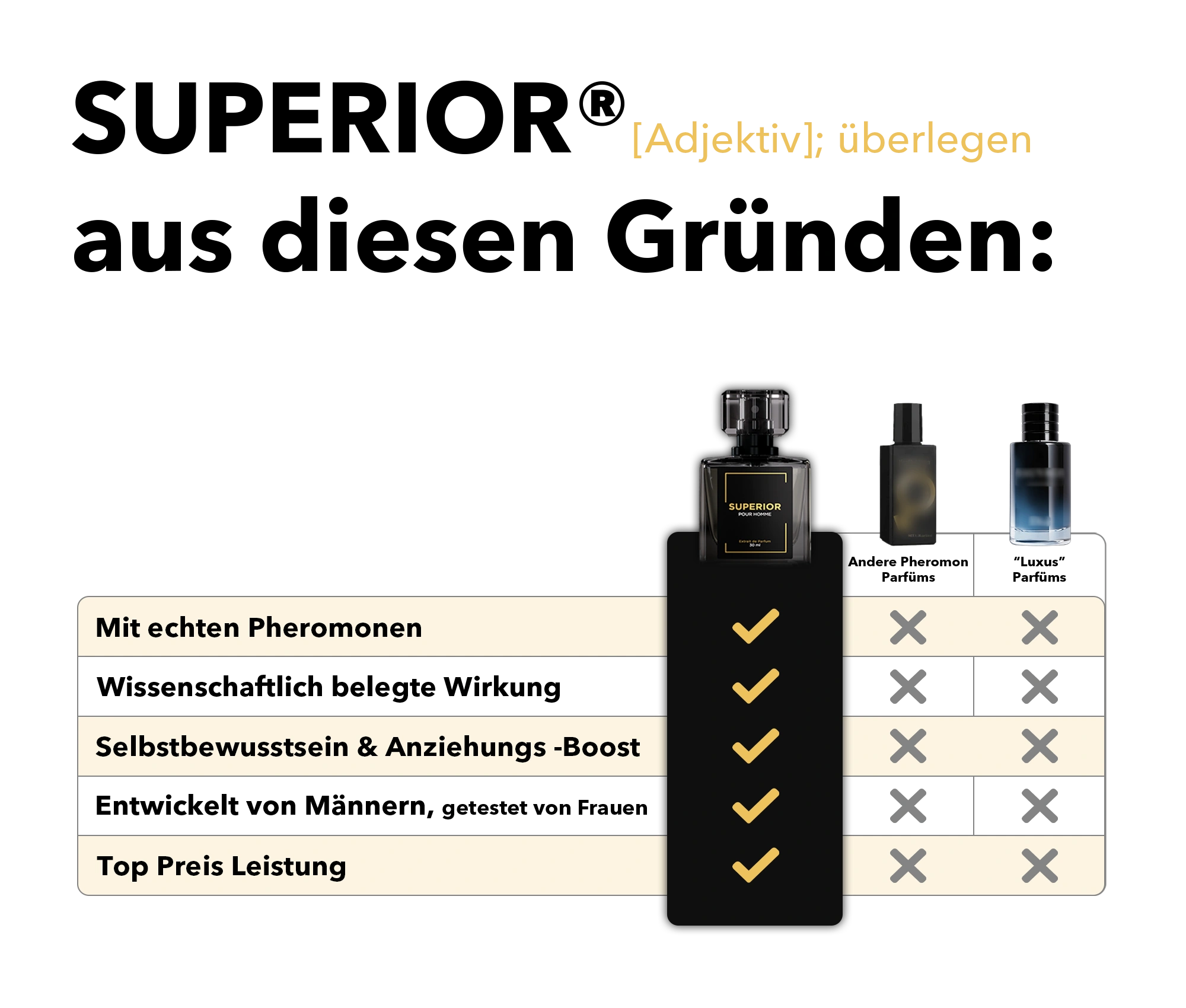SUPERIOR® ist das Ergebnis jahrelanger Forschung im Bereich der Pheromonwirkung. Die geheime Androstenon-Formel wurde entwickelt, um deine Anziehungskraft zu maximieren.